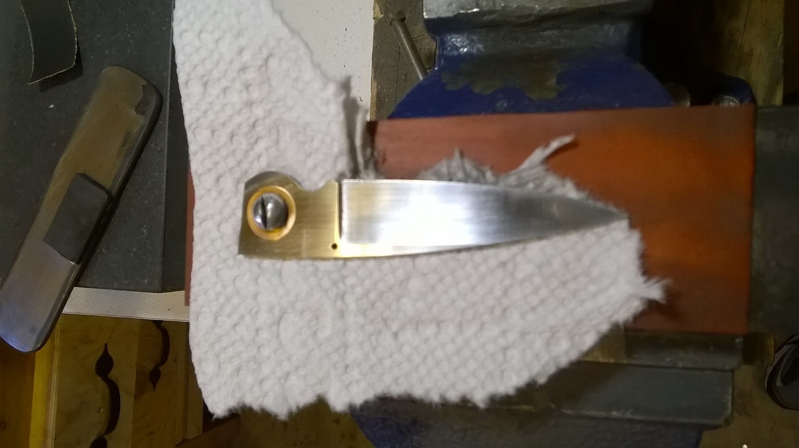 You may have to get out your magnifying glass, but if you look very closely at the bottom corner of this liner, you will see a little black dot. That's what it looks like when you break off a tap in a hole when trying to cut threads into titanium. This doesn't happen to me very often anymore, but I used to just scrap the liner because that little piece was impossible to get out. I recently heard of a trick used by other knife makers when this happens to them.